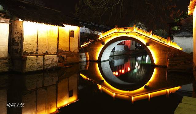 穿过一个又一个石桥,在这春寒料峭的晚上,看最能体现水乡神韵的双桥,便别有一番风味了。桥洞里都镶嵌着一束束彩灯,灯光映入河面,又把这座千年古桥的倒影映在河面上。于是,水上一对桥,水下一双桥,清水荡漾,如梦似幻。