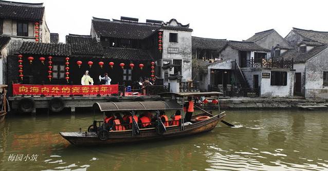 一进入古镇,就被拥挤的人群呛到了。虽然,依旧是灰墙黛瓦、烟雨长廊、小桥流水、桨声船影,却淹没在铺天盖地的人流之中。喧嚣的人潮把不大的一个古镇寄了个风雨不透、水泄不通!提着箱子,走在人群里,实在没有了少了些味道,无奈啊!好在,距离不是很远,很快就走到了长廊客栈,一个闹中取静的所在。