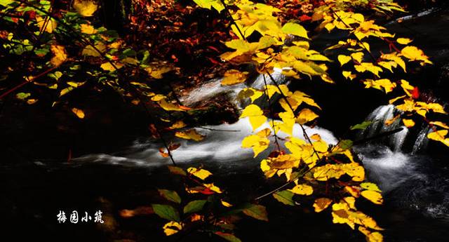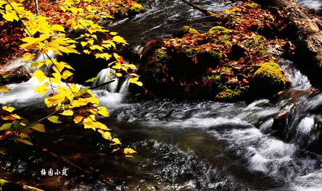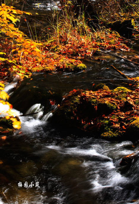 如果你以为只有蓝色和绿色,那就太低估大自然的创造力了。孔雀河道蜿蜒而行,两侧丛生灌木,杂树,深秋的落叶密密匝匝地布满了整条河川,为那纯粹的色彩增加的节日的气氛,于是,孔雀河道忽然热闹了起来,一道斑驳的激流牵扯着一个彩色的世界,一只霓裳女儿曲,在山野间伴着溪水的跳跃而舞动。