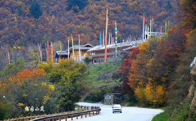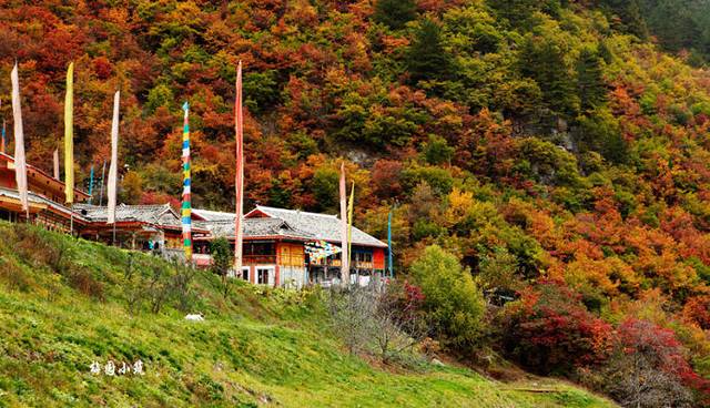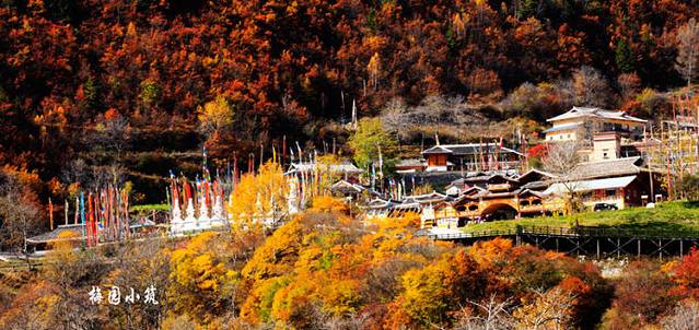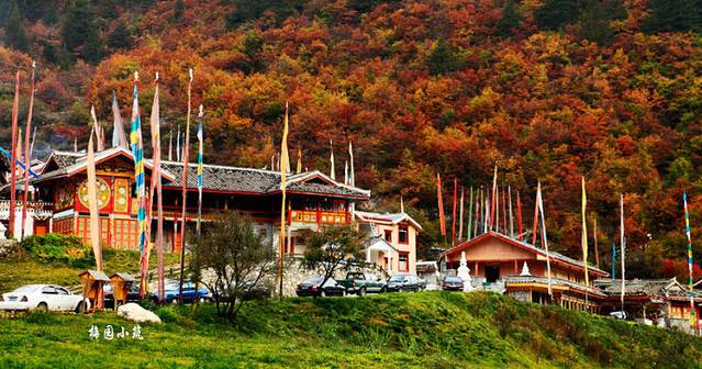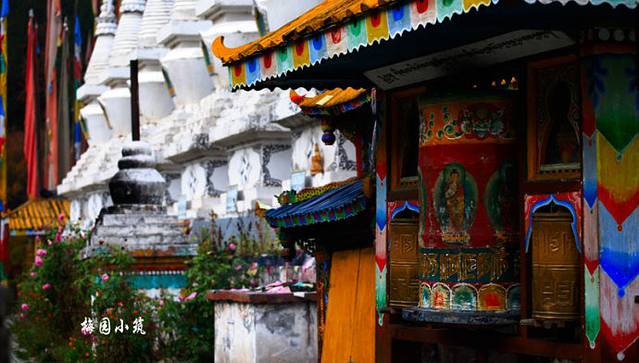 路的尽头是磨坊,清澈的水就从树丛中带着几分调皮似的钻出,在树木上、岩石上激起簇簇浪花,然后跳跃着一直向磨坊奔流而去,不断推动着磨房和转经房的木轮,吱吱嘎嘎地转动着,为依然有着信仰的人们祈福