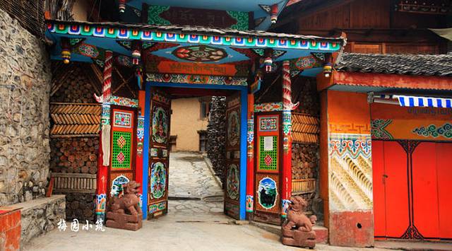 藏族同胞把我接进去他家,穿过拱状的寨门往山上走,就是寨子里最宽敞的一条主路,道路两边遍布小店,卖着千篇一律的工艺品和藏寨服装。抬眼望去,依山而建的寨子里到处飘扬着具有藏族特色的经幡和风马旗,随着风呼啦啦地抖动着,一遍一遍地为这原始而又现代的山寨祈福。