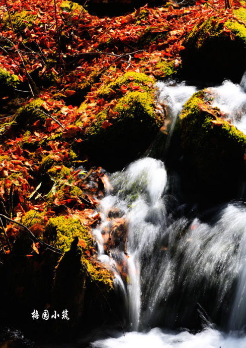 对面的路,跟日则沟一样,都是一米左右宽的木栈道,因为没有多少人行走,栈道上,铺着厚厚的落叶,红色的,黄色的,褐色的,象地毯,很原始,很天然。踩上去沙沙作响,和着身边奔腾的流水,林间不时透下的温暖阳光,加之一两声清脆的鸟鸣,好一曲山野协奏欢歌,让我恍惚以为走在天堂