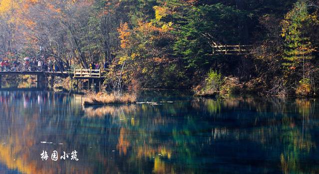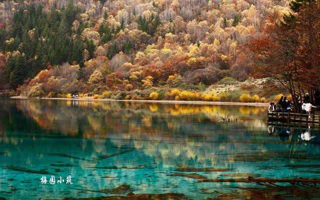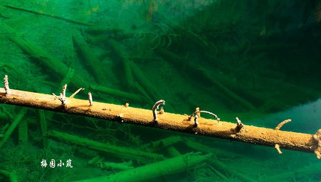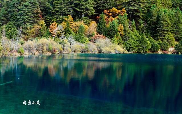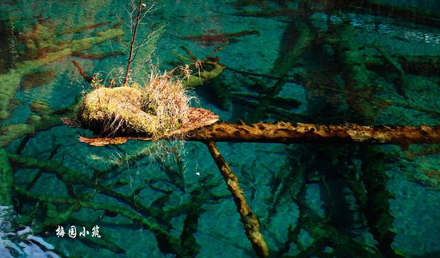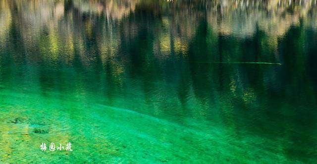 除了那缤纷的色彩,五花海的水还是清澈见底的,可以清晰地看见几米以下的水生植物,草绿色的藻类、苔藓千姿百态,向四面八方伸展着,延伸着,就像是在宣告自己就是水中的主宰;而横亘在水中的树钙化成像珊瑚一样美丽的图案,虽然没有珊瑚的色,却有着珊瑚美丽的形;而水面上的倒映着的那一株株交织成锦的彩叶,如火焰流金,若夏花绚烂,更加朦胧了人的心思,不明白到底哪里是水面,哪里是水下。亦不知道哪里更美,是水上,还是水下。