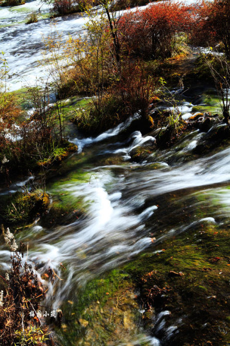 水,在浅滩上,急匆匆地奔跑着,在阳光照射下,一团团跳跃的水花,就像是一个个晶莹剔透的珍珠,散落在一簇簇的灌木周围,折射出耀眼的光;而平整处呢,又像是在风中抖动的丝绸,怎么看,都透着一股恬静来