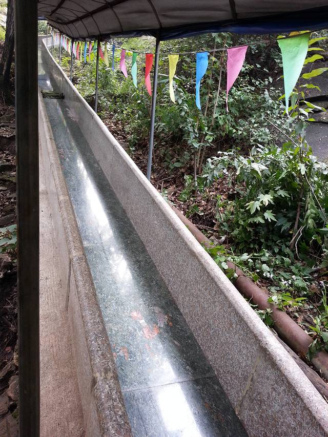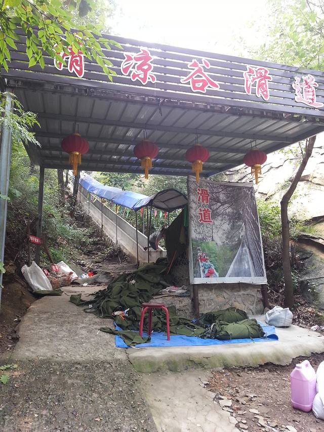 清凉谷的这个滑道有点坑爹,小孩玩的挺高兴,对大人来说就是找罪受,屁股下垫块布,完全靠脚刹控制速度,磨得是屁股,呵呵。30元/位,大人孩子都要分别买票,呵呵。反正我是从旁边走下来的。