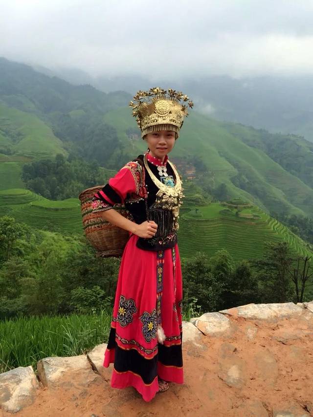 酒店很安静,住着很舒服,不像其它吊角楼动静很大隔音又不好。第二天早上为了看日出5点半就起床了,往窗外看玻璃都是湿气水汽。外面也有雾,天气不太好太阳被遮住了,天边露出几抹小红光,看不了日出,有点可惜。洗漱整理完行李后我们下了楼点了桂林米粉吃,边吃边看向雾气遮住了的梯田,有点担心下一站的景点看不了。七点半我们出发到七星追月,半路又遇到老奶奶,打了招呼后,继续前行,爬了一个小时到达七星追月,感觉像翻了一座山。所谓“七星追月”,是梯田中指有七座小土堆,就像天上的七颗星星,在追一轮明月,很唯美,为了更好的同美景融合一起,我决定向当地人租套壮族姑娘衣服,把这一刻留下来。