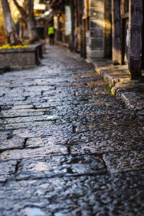 脚下的路,是用五彩石铺成,经过千百年人马的踩磨,已经凸凹斑驳,在暖阳下,泛着古朴的光。路的两边,是触手可及的茶楼店铺和纳西民居,一概的青瓦木楼,栉次鳞比,伸向视线的尽头。