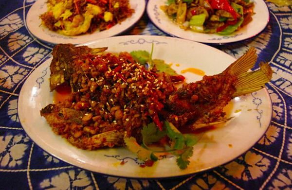 豆豉烤鱼 38、松茸炒腊肉55、树花炒蛋28、酸辣米线12、大理啤酒16、皮蛋香菜汤 12