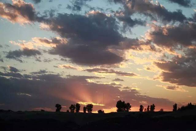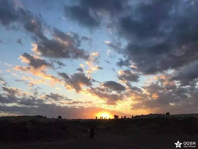 天水谷到奈曼的路只有一点高速,路况还可以,慢悠悠的走,傍晚进了城。沙丘上正是落日余晖,先跑去一饱眼福。落日正好从远处的沙漠缓缓下落,满天云朵被映照出各种色彩,壮观啊!