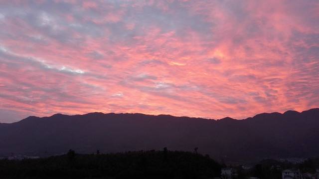 村里的清晨安静,没有打扰的情况下突然醒过来,觉得哪不对,看墙上,一片菲红,看窗外,一大片鲜红的朝霞正从望仙山边漫延过来,楼下池塘也趁机映出粉红,如此池塘共长天一色的红,少见。跑上四楼,五分钟后,红霞消失,云朵恢复了往常的铅灰,就象刚接待完贵宾之后红地毯就被迅速收起。