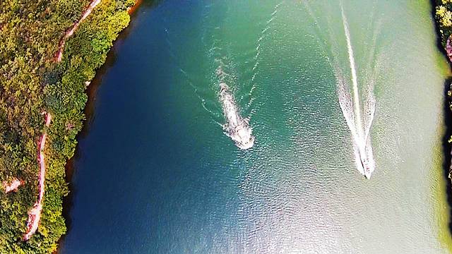 继续爬升,在130米高度悬停,刚好有两艘快艇过来,迅速抓拍