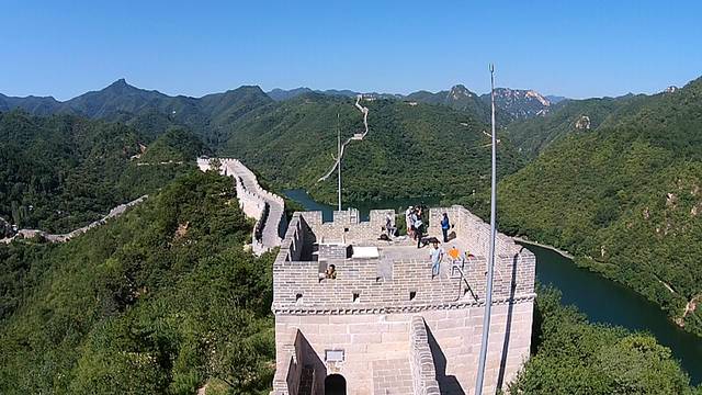 搞定住宿后背上小精灵向景区开拔,过了水库大坝顺着台阶爬上长城,爬了一段遇到韩国SBS电视台的某个纪录片剧组,他们也是听说三段长城入水的美景慕名而来,来了之后被深深的吸引住了。期间中方被受邀给他们拍摄一段空中视频。在一怕丢,二怕拍得不好的心理下,硬着头皮拍了一段算是交差了。为了不错过好景,还是超越剧组自己拍啦。
