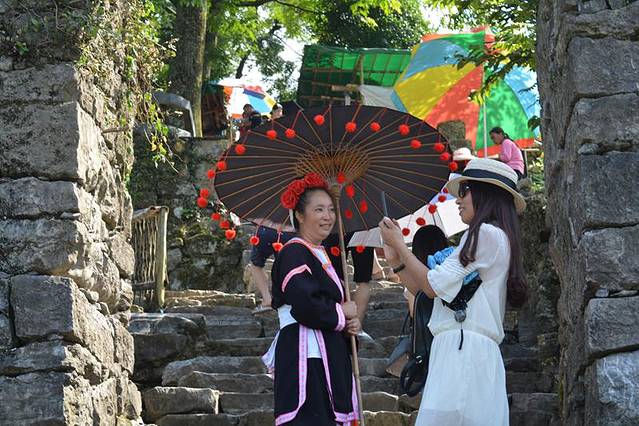 游客稀稀朗朗占满了村寨,碰到很多爱好摄影的游客在古寨中采风,见到那么多高级别单反,青砖灰瓦与瑶族服装相交辉映,古寨的宁静多了些许的喧嚣,心中淡淡的忧愁,寨子的瑶胞你们好吗?
