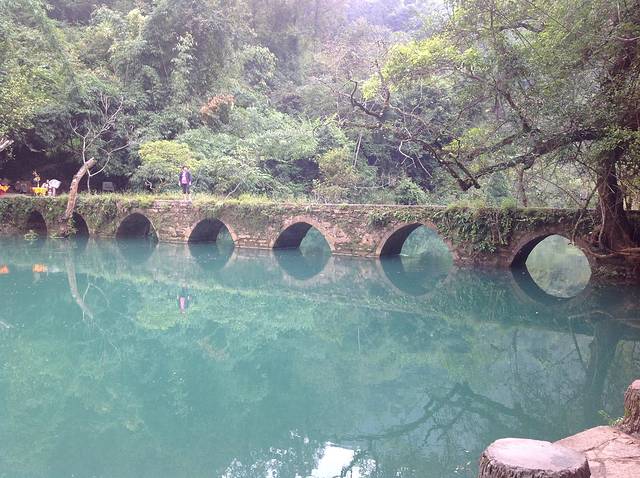 8:00 进入景区,乘坐观光车,乘观光车之前要领车票,主要景点都有显示,每乘车到一个景点之前,工作人员会先撕去要到景点的票,外加3张返程票。可能是我9月刚从九寨沟玩了回来,对九寨沟的美记忆犹新,所以对号称小九寨的小七孔就没什么感觉了。不过其中有一个景点果断推荐,非常有趣,值得一游——水上森林。进入景点后并不是走修好的栈道,而是走一个个的石墩,石墩是不规则的伫立在水中间的,有时很平坦,有时又是高低不平,好像一不小心就会踩进水里,很有一种探险的趣味。水上森林是不走回头路的,从入口走到出口大约要1个多小时。水上森林里有卖新鲜红枣的,用山间“矿泉水”冲洗,吃起来凉凉的,特别甜 20元/斤。炒板栗也不错,刚炒出来热热的,粉粉的。