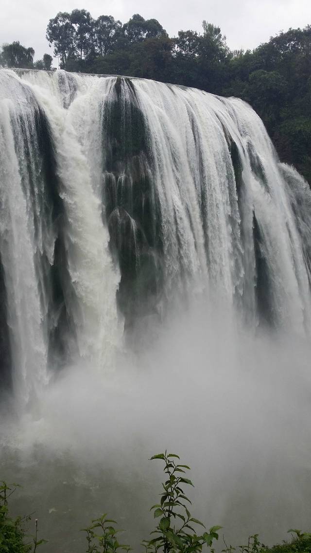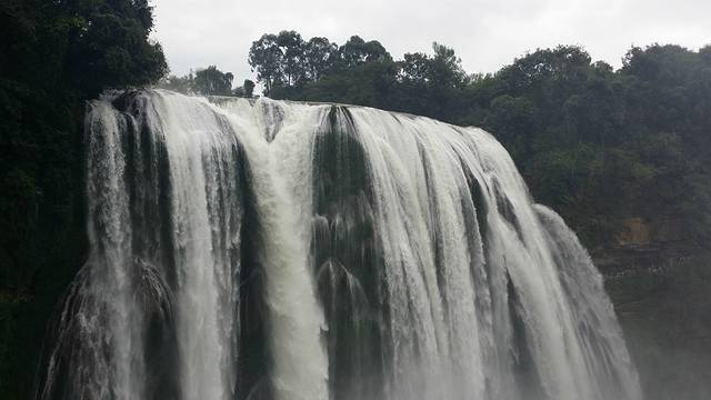 8:00 出发去黄果树瀑布,原定计划本来是打算第二天在贵阳玩一天的,休整一下的,因为前一天开了一整天的车,虽然我也考了驾照,但不常开,所以我爸没敢让我开车,由他自己开了11个小时开到了贵阳...如果是这样的话,我们明天玩一天黄果树瀑布后就得立马开车去荔波住,这样会很累很赶。于是我妈5号晚上立马拍板决定,我们第二天就去黄果树瀑布,这样第三天玩玩贵阳市就可以轻轻松松的开去荔波睡。事实再一次证明了我妈的决定是多么的正确,我们查了贵阳近一周的天气都是下雨,谁知道第二天一早出发的时候居然天晴了,没下雨,也不是很晒,实在是个出门游玩的好天气。贵阳——安顺黄果树瀑布130.6公里,开车差不多2小时,高速很容易找,就是昨天来时的G60沪昆高速,沿着沪昆高速一直走很容易就到了,只是要导航看清楚那个闸道进入高速,哪个闸道出高速。虽然说这已经是国庆节的尾巴,但玩黄果树瀑布的人还真不少,把车停在停车场,一天10元的停车费,排了长长的队,买了门票后进入景区,坐环保车开始游玩。黄果树瀑布门票价钱是180元/人,环保车50/人(一个景点坐一次),包含三个景点:天星桥、黄果树瀑布、陡坡塘瀑布。这个顺序是我在网上找到的游玩顺序,因为他们呈三角形,顺着玩或逆着玩都可以,然而悲催的是,我们直接被环保车拉到了中间的黄果树瀑布,看完后,从黄果树瀑布停车场坐车绕过了大门口,绕过了陡坡塘瀑布,到了天星桥,看完天星桥后在天星桥停车场坐车,又绕过了黄果树,绕过了大门口才到了陡坡塘,也就是说我们就看这么三个景点,硬是在里面绕了3圈,坐车玩。所以进门后上环保车前一定要确定车是去哪的。