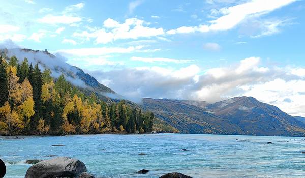 终于看到有湖怪的喀纳斯了湖了...怎么形容它呢?就像是不经意间突然在你眼前跳出了一个蓝绿色的缎带,波光鳞鳞,那样清澈,让人清净安心。缎带的颜色不止一种,阳光的照耀使它一会变成了宝石蓝,一会天青蓝,偶尔还有孔雀蓝……(原谅我乏味的形容词...)
