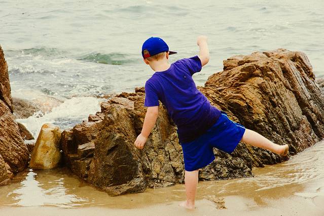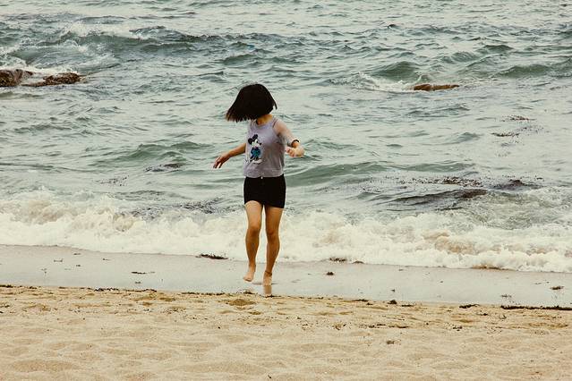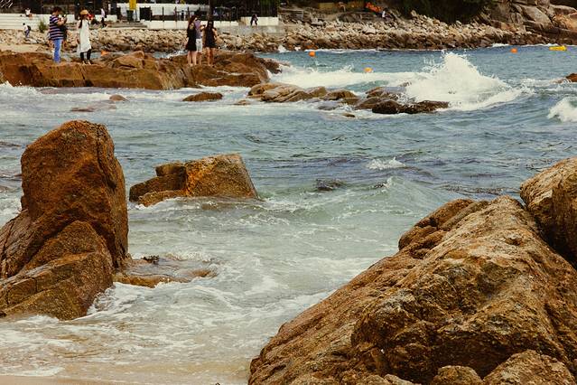再次回到路口前往洪圣爷湾。沙滩还不错,很多人在玩水,我们爬上石头,拍了一些照片就下来了,继续前往索罟湾。