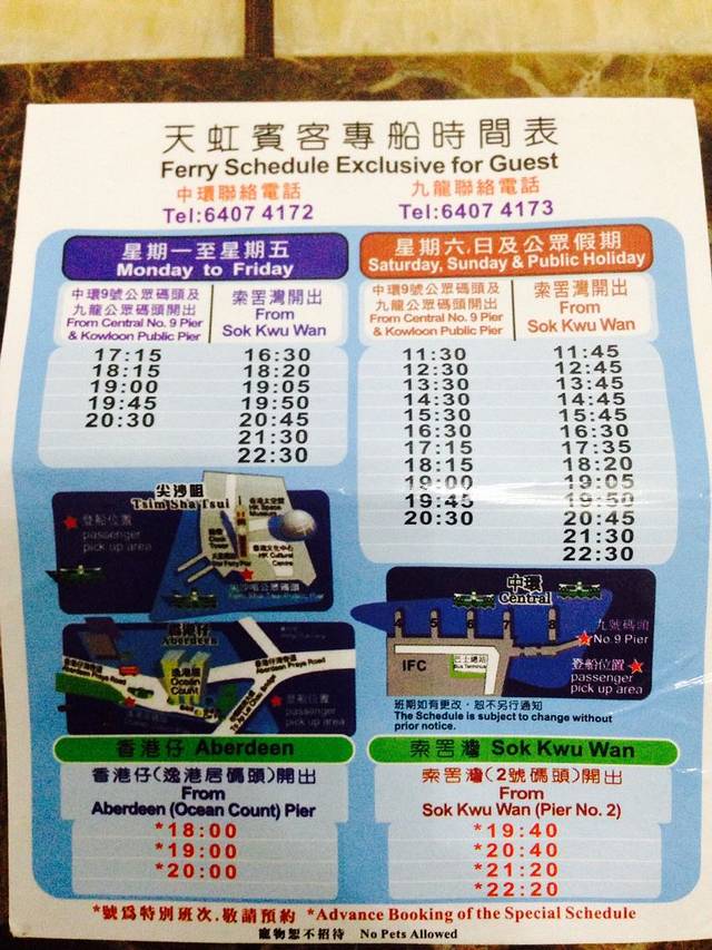 去程:罗湖口岸过关,乘坐列车经九龙塘转地铁到中环站,A出口出来右手边有天桥,过天桥往右边走能看到指示牌,直走就能看到中环码头了,去南丫岛的船是4号码头。
