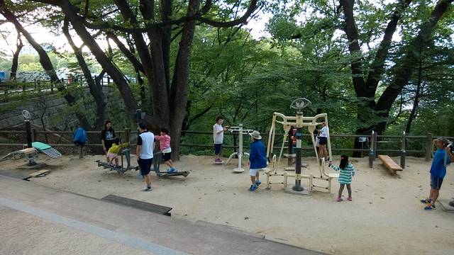 走到半山腰,就能俯瞰下面的城市啦~而且还有一个小小的健身场地~小朋友和成年人们都玩的不亦乐乎,其乐融融呢!