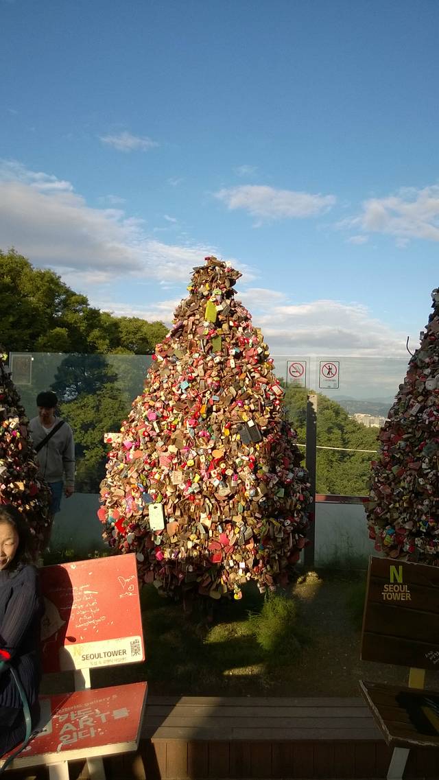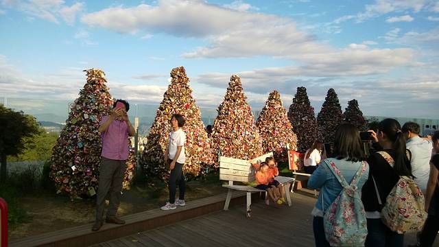 到了山顶,天色由阴转晴,太阳也从云中露出头来。阳光照在了……山顶的各种连心锁连成的“铁树”上!这些锁也是南山塔一景呢~恋人们跑到这里,在锁上写上彼此的名字,然后就锁在这儿了!也有许下愿望锁上去的!哈哈~前面还有适合拍照留念的长椅,我和姐姐也拜托旁边的游人给我们在那拍了一张合照呢~!