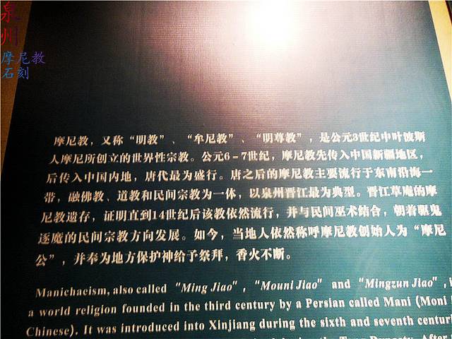 这种宗教是我来泉州第一次听说的宗教,后来百度了一下有了一些了解。摩尼教又称“明教”发源于古代波斯萨珊王朝,为公元三世纪波斯人摩尼所创立。受基督教等一些宗教影响,摩尼声称自己是神的先知,也是最后一位先知。摩尼教在中国具有极其重要的地位,两个朝代的建设都和摩尼教有关。至今福建晋江仍存有小型摩尼寺,19世纪以来在敦煌、吐鲁番等地发现大量摩尼教文书,证明曾在中国广泛传播。