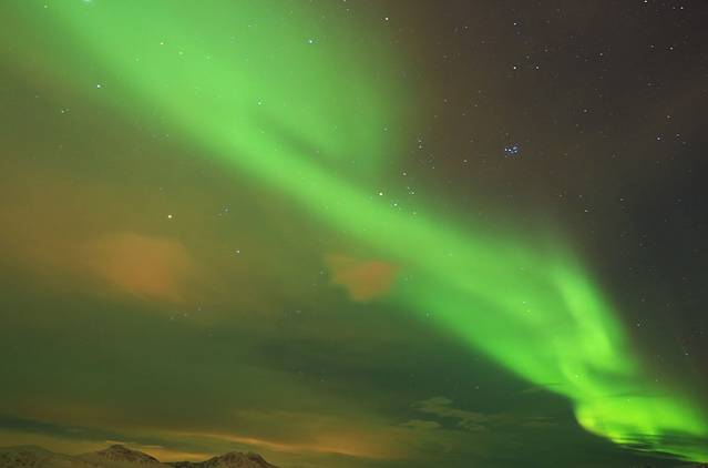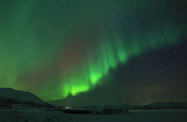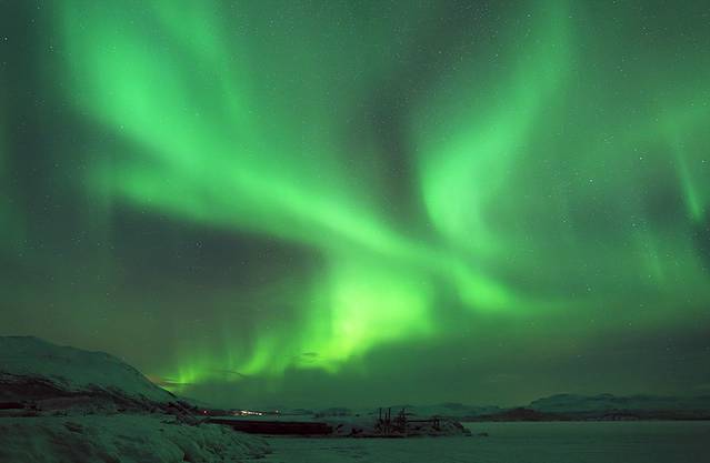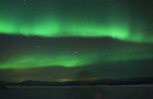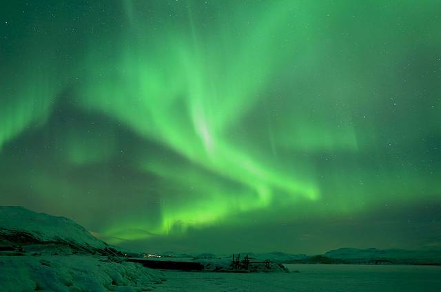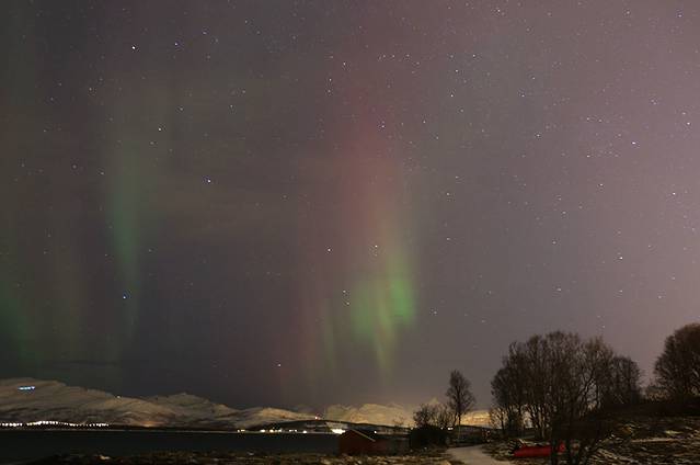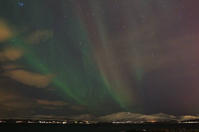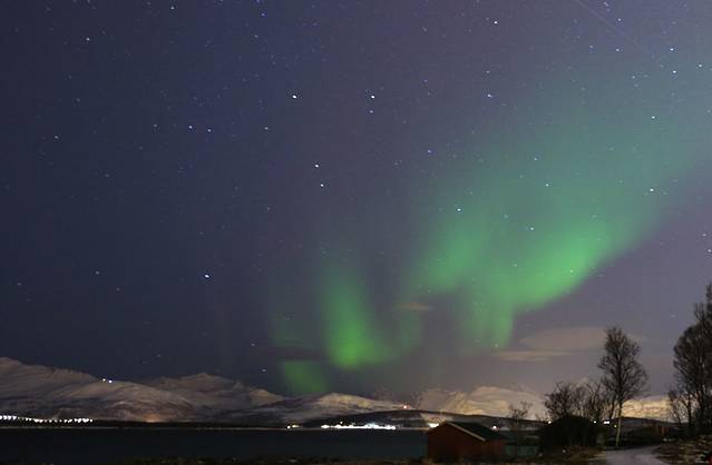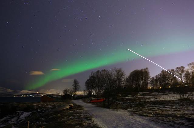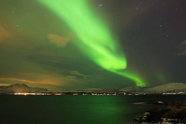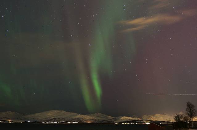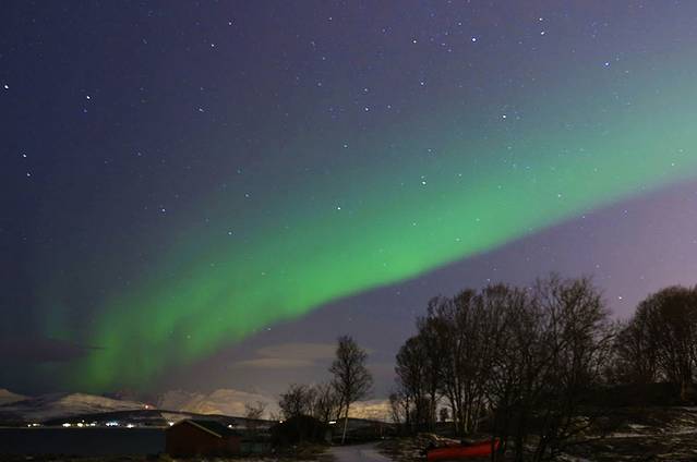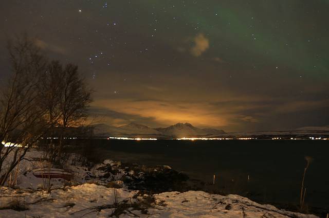 再坐34路返回酒店,九点多去峡湾边上看最后一次北极光。图中白色的光线是特鲁姆瑟机场起飞航班的灯光。