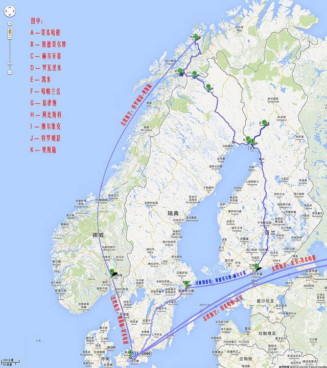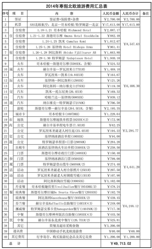 本次自助游行程如下:北京-->哥本哈根-->斯德哥尔摩-->赫尔辛基-->罗瓦涅米-->凯米-->哈帕兰达-->基律纳-->阿比斯科-->纳尔维克-->特罗姆瑟-->奥斯陆-->哥本哈根-->北京。时间从2014年1月18日到1月31日。