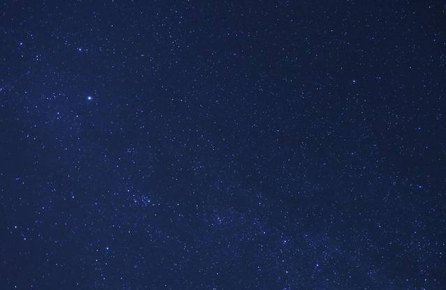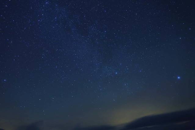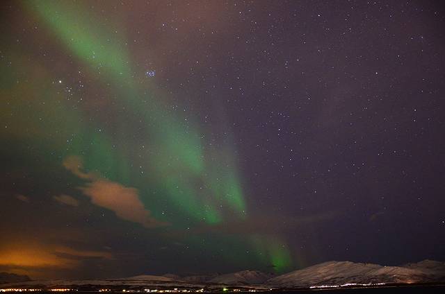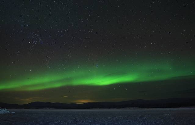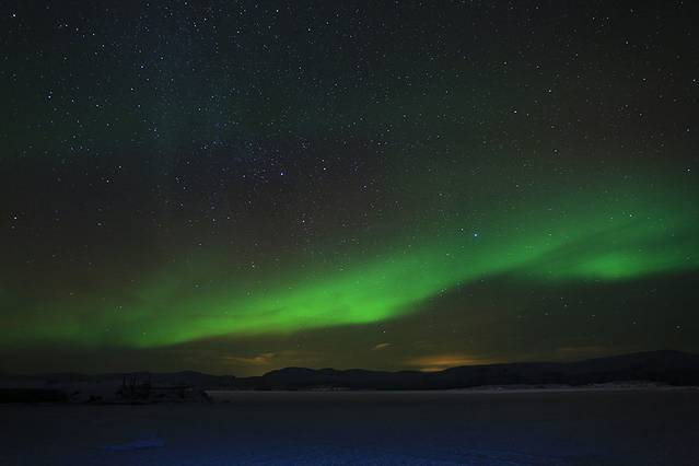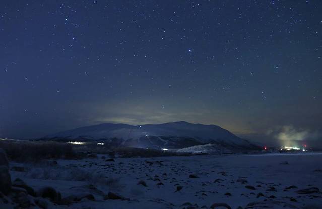 看到对面山顶上有淡淡的灰白色,我们把镜头转过去,拍出来不是极光,还是远处的城市灯光。