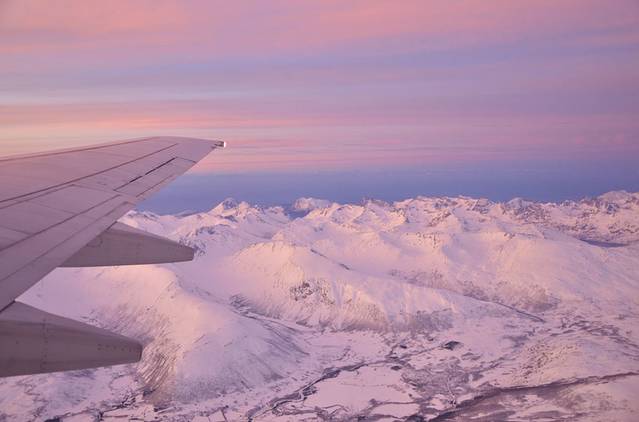 波音737平稳掠过跑道,很快就融入到峡湾上空的绚丽的晚霞之中。