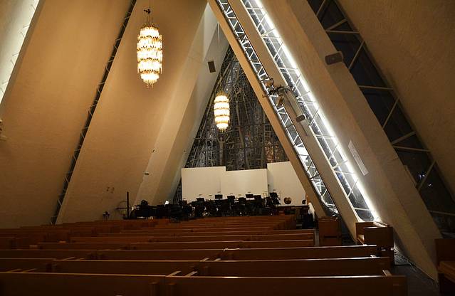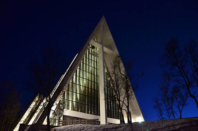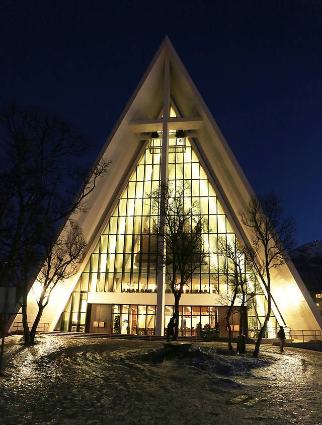 北极教堂两侧的条状玻璃采光窗完美利用了极昼时阳光的入射角度,可以使夏季里午夜的光线刚好从缝隙中透射进来,每年夏天这里都要举行盛大的“午夜太阳音乐会”。