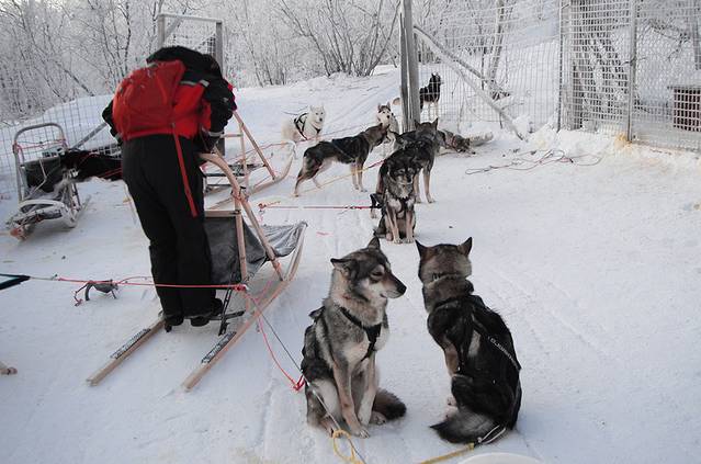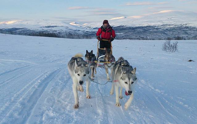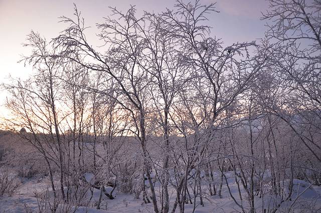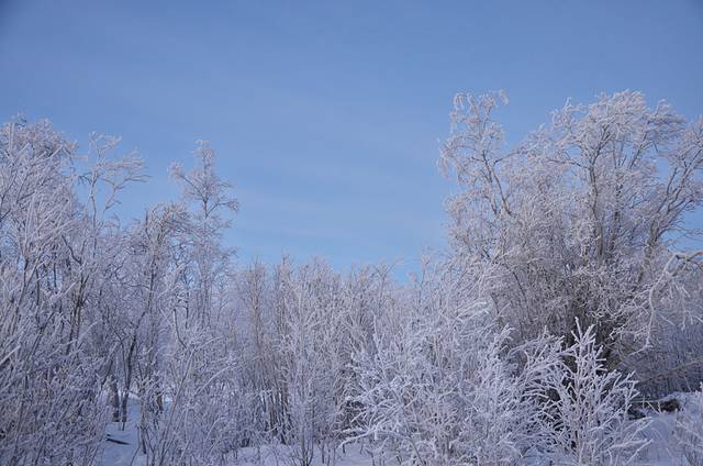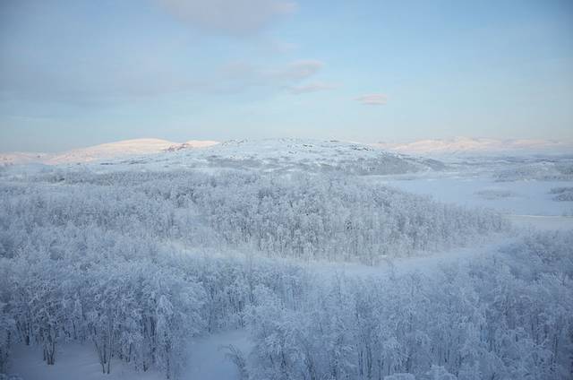 很快,狗狗们冲出了密密的树林,完全奔跑在开阔的雪原上,周围白雪皑皑的群山环抱,我站在风驰电掣的雪橇上想,几百年前是不是也有个萨米人,就像我这样驾着狗,呼啸着掠过这片原野?