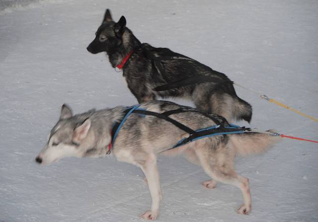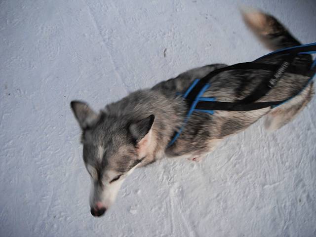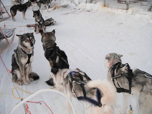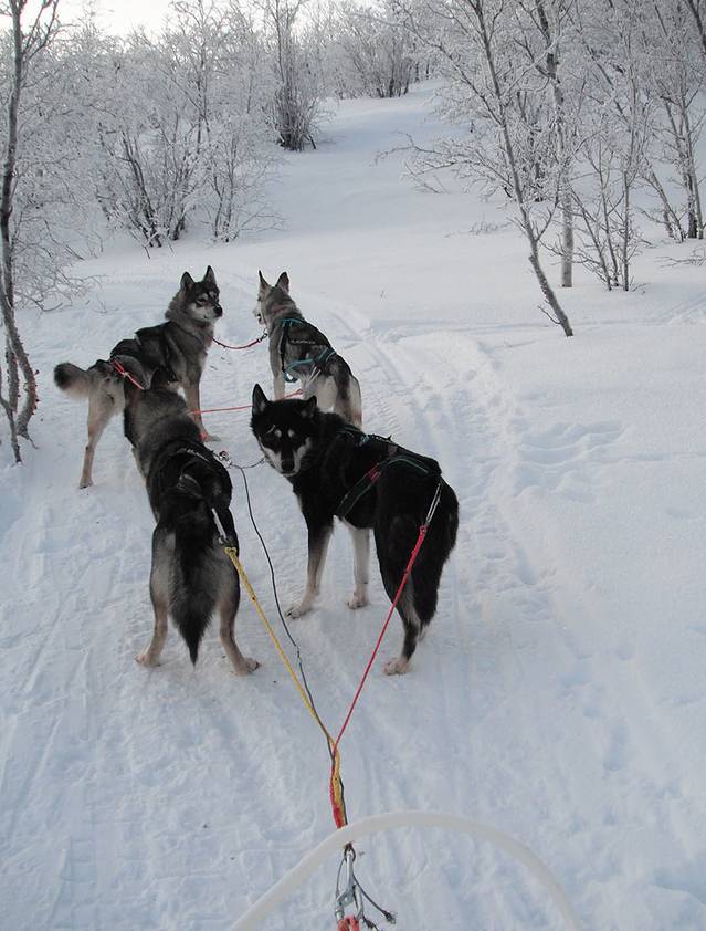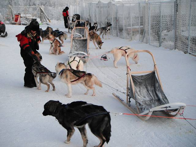 狗狗们在雪地上跑得飞快,两边的树木刷刷掠过,要是掌握好平衡可以少用刹车,那速度一点不比雪地摩托慢。我踩住刹车,为拉我的四只狗狗们拍照留念(对了,玩这个最好别带笨重的单反相机,摔跤时也不好保护,我随身携带了一只小巧的防水相机。而且途中工作人员也会用单反相机给大家拍几张照片,活动完毕后,可免费索取)。