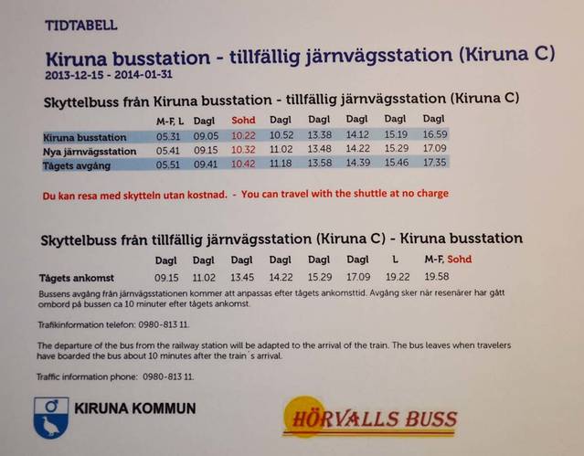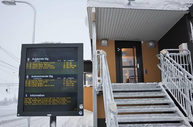 火车:基律纳新火车站 14:39 16:05 阿比斯科Östra(当天的火车被取消,改为汽车,又晚点3小时,19:10才抵达阿比斯科)