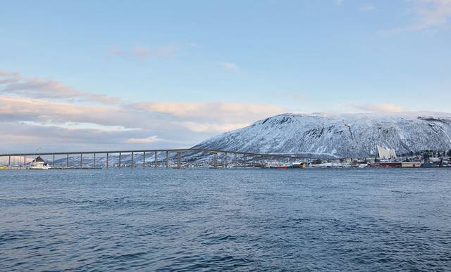 从北挪威艺术馆出来,东边几十米就是峡湾边上。雄伟的特罗姆瑟大桥和作为背景的斯托尔斯泰纳山。