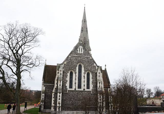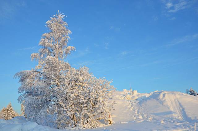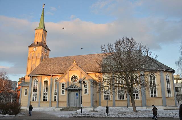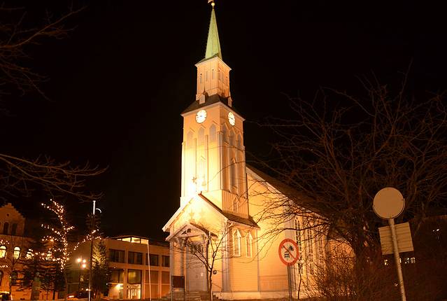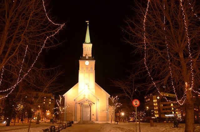路过特罗姆瑟大教堂。树上还装饰着彩灯。