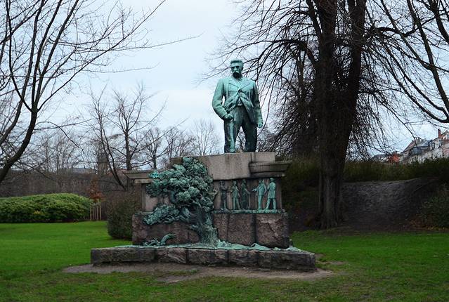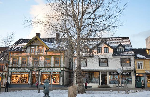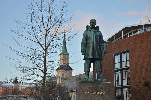 我们往市区里面走,汽车站附近伫立的极地探险家阿蒙森雕像,他的背后就是特罗姆瑟大教堂。