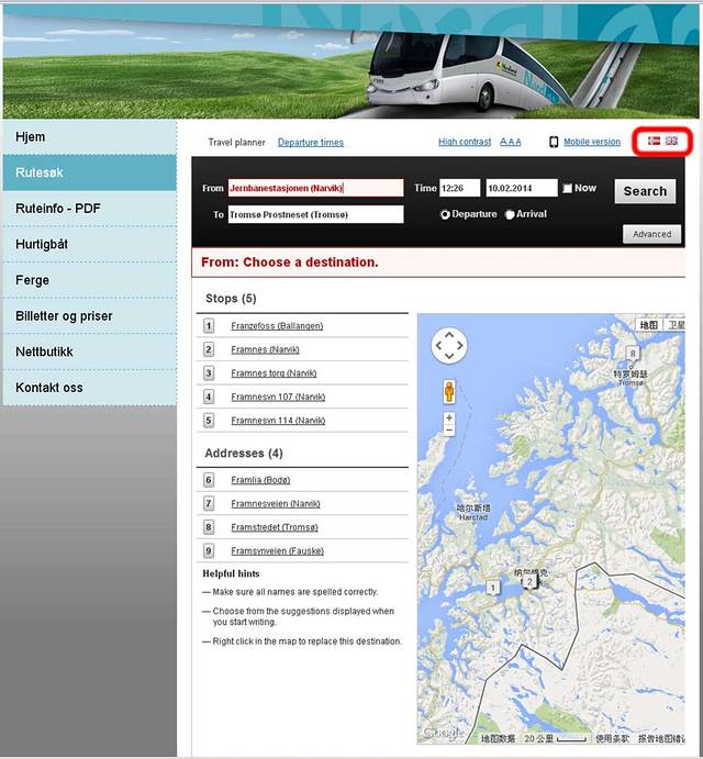 汽车:纳尔维克火车站 15:37 特罗姆瑟长途汽车站 19:50