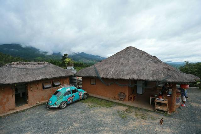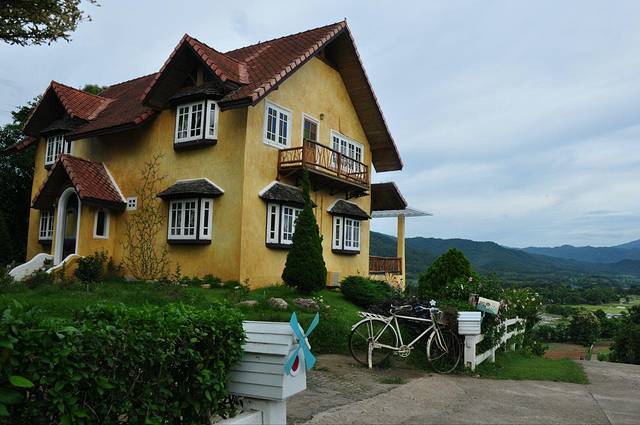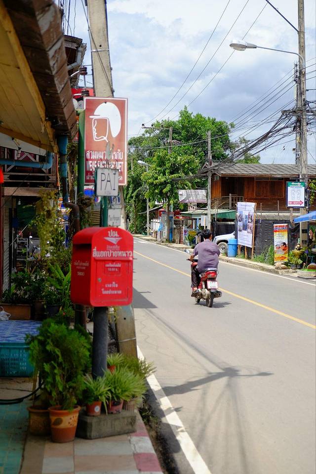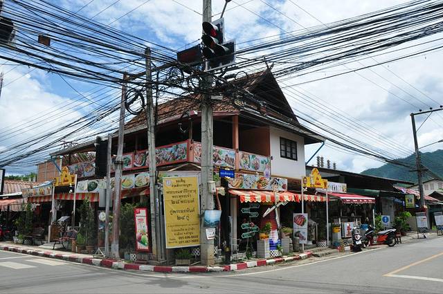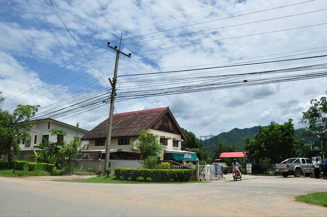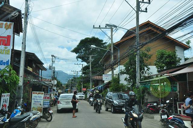 如果我们从地图上面来寻找拜县的话,便会发现它就是一个紧紧依靠着拜河,坐落在夜风颂和清迈之间的泰北小城镇。从清迈坐车去拜县距离大约是一百三十五公里,其中有一百公里的路程都是崎岖蜿蜒的山路,需要三个多小时,一共有700多个弯。一路,泰式木屋,欧式小屋和各种森林农田穿插于其中。