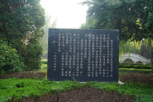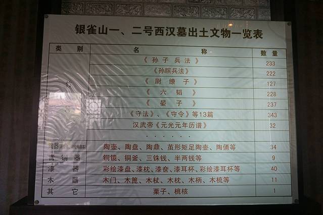 这个博物馆是全国第一座汉墓竹简博物馆,也一座遗址性专题博物馆,主要文物是两座汉墓共出土竹简7500余枚。一号墓竹简内容有《孙子兵法》十三篇、《孙膑兵法》十六篇和佚文五篇;二号墓竹简内容有《汉武帝元光元年历谱》。