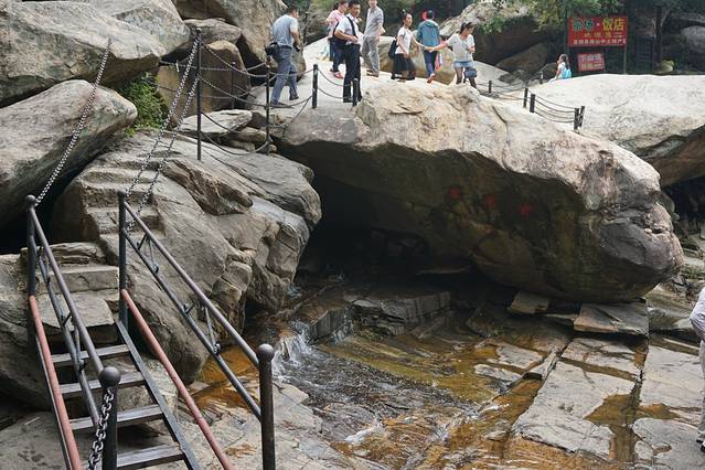 进入山谷,首先碰到的是三龙潭,潭水清澈,游鱼可数,旁边巨石斜立如棚,岌岌可危,令人不敢近前。雨季涧水湍流入潭,犹如一幅宽宽的银幕。