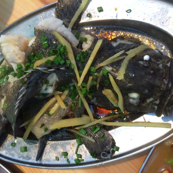 在食为先海鲜加工店吃的清蒸石斑鱼,肉质鲜美。老板说石斑鱼要趁热吃,不然鱼皮上的胶质成分会使鱼皮变韧,鱼肉也会变老。