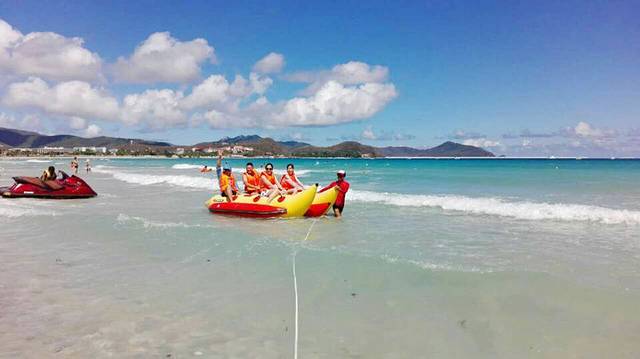 小憩时间到下午2点左右,我们的集体活动开始了,下一个项目是香蕉船。教练骑摩托艇牵引一排香蕉船,船上坐3到4人,在教练精湛技艺的带领下,我们的香蕉船在海面窜起又摔向海面,水花溅起,尖叫声也此起彼伏,这刺激的劲头与过山车相比是有过之而无不及。