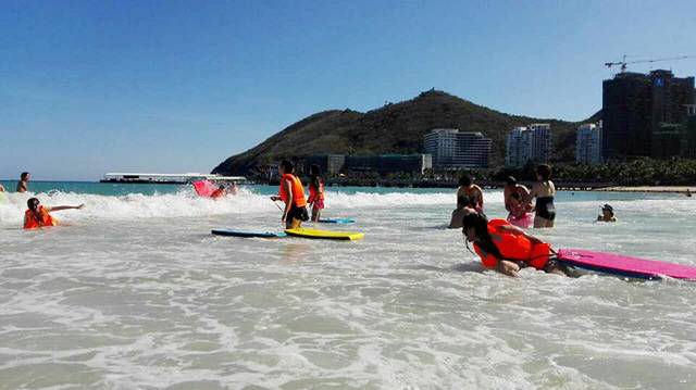 一圈结束后,教练带我们抱着冲浪板冲浪,这是个好玩的道具,它并不是像电视上看到的那种站在冲浪板上的冲浪,而是抱着冲浪板,用预备跑的姿势站在齐腰的水中,等一股大浪打来时顺势蹬腿趴在冲浪板上,海浪就会将你送向岸边,划水的距离与浪的大小和你掌握的技巧有很大关系。不得不说,确实挺好玩。我的姐妹更搞笑,她玩累了,干脆趴在冲浪板上不动了,任海浪来回冲打她。我们玩得尽兴的时候,引来了周围玩水游客的羡慕,一伙帅哥看着眼馋,问教练哪里能租来。教练回答说这是我们的客人免费玩的,不外租。帅哥更是对我们另眼相看,趁教练不注意和我偷偷商量能否让他体验一把,看他实在眼馋,我便教他要领借他耍一次,没想到他第一次玩便掌握了要领,冲得距离挺远,他很识趣得把板送还回来,脸上满是满足和意犹未尽的表情。