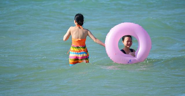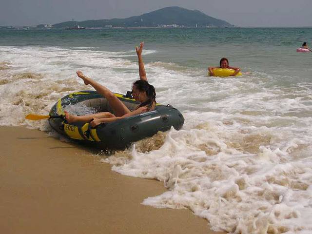 过了把嘴瘾后,我和姐妹带着皮划艇又下海了,我们本担心两人上皮划艇后不好控制,担心皮艇被浪送远,没想到教练在水中帮我们看守,跑远了帮我们拉回来;被送到岸边了,再帮我们推回去,压根不需要我们用船桨。很搞笑的是,为了防晒,我和姐妹在皮艇上一人打了一把伞,海浪送着我们在水中飘荡,伞荫下海风送来丝丝凉爽,很舒服。但此时水中的教练却逗趣了,他说他接待了上万名游客,打着伞玩皮划艇的我们还是头一个。是呀,那个场景越想越搞笑,我俩也着实成了海边一道风景线。