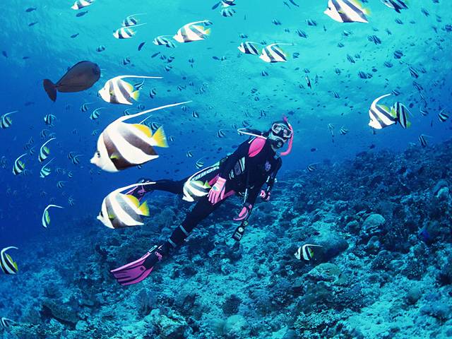 就这样穿行了不知多久,慢慢地有斑斓的鱼群在周身围绕,它们很好客,期间有一只小鱼还俏皮地吻了我的手。慢慢地鱼群的个头也逐渐变大,他们毫不怯生,甚至有欢迎的意思。都说鱼儿只有3秒的记忆,我在想不知道下一秒它们还会不会记得曾有一个庞然大物从他们身边游过。在教练的带领下,我逐渐地看穿了一片蔚蓝,海底的珊瑚也越发地清晰,鱼儿在珊瑚间自在地休憩,这里是他们的家。