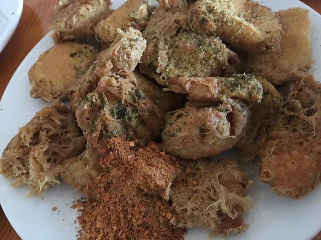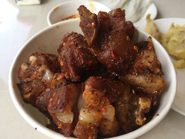 我们点了风味烤猪蹄、土罐米线、泸西大洋芋、小卷粉、烤大肠,还有石屏豆腐,这些小吃味道都特别好,猪蹄弄得很干净,不喜欢猪蹄上面有猪毛,这里的完全没有;大洋芋的蘸水很多很丰富,调制自己喜欢的口味,拌着洋芋吃,很可口;我们吃了这么多的东西,差不多80元,价格很便宜。