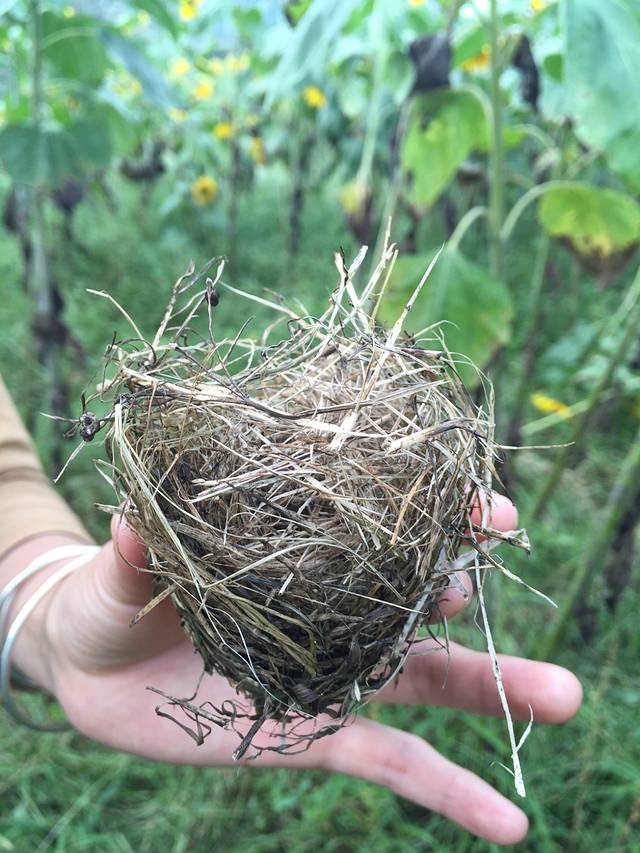 这是在向日葵花海中找到的鸟巢,这个鸟巢筑得很美。