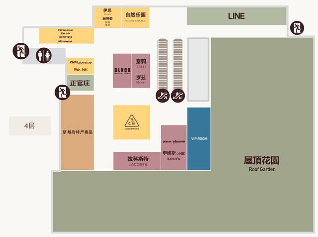 4F大部分区域是屋顶花园,也有一部分专柜是济州岛特产、护肤品和一些服装店。