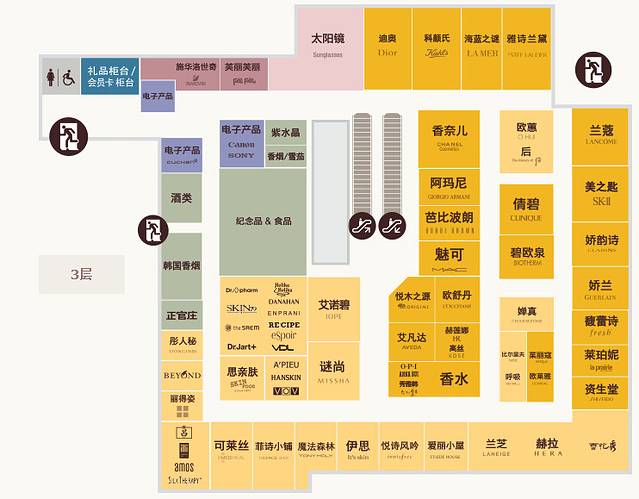 3F出售一些国际品牌的护肤化妆品以及香水,其中还有一部分纪念品、食品以及电子设备专柜。