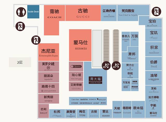 2F出售手表、时装以及包类商品,比较有名的就是Hermes、GUCCI、Coach、浪琴、OMEGA、宝珀等品牌。